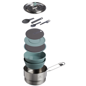 The 14-piece Wildfare Go Two Bowl Prep & Cook Set nests neatly together for efficiency. Open the 1.65-quart stainless steel saucepan to find two 16-ounce bowls inside. The included two-piece spatula and pair of dual-sided sporks go easily from compact to full sized. Nonslip cutting boards include removable silicone trivets. All the luxury of cooking at home. in the wild with a fully equipped 14-piece camp cookware set designed for trail-ready convenience.